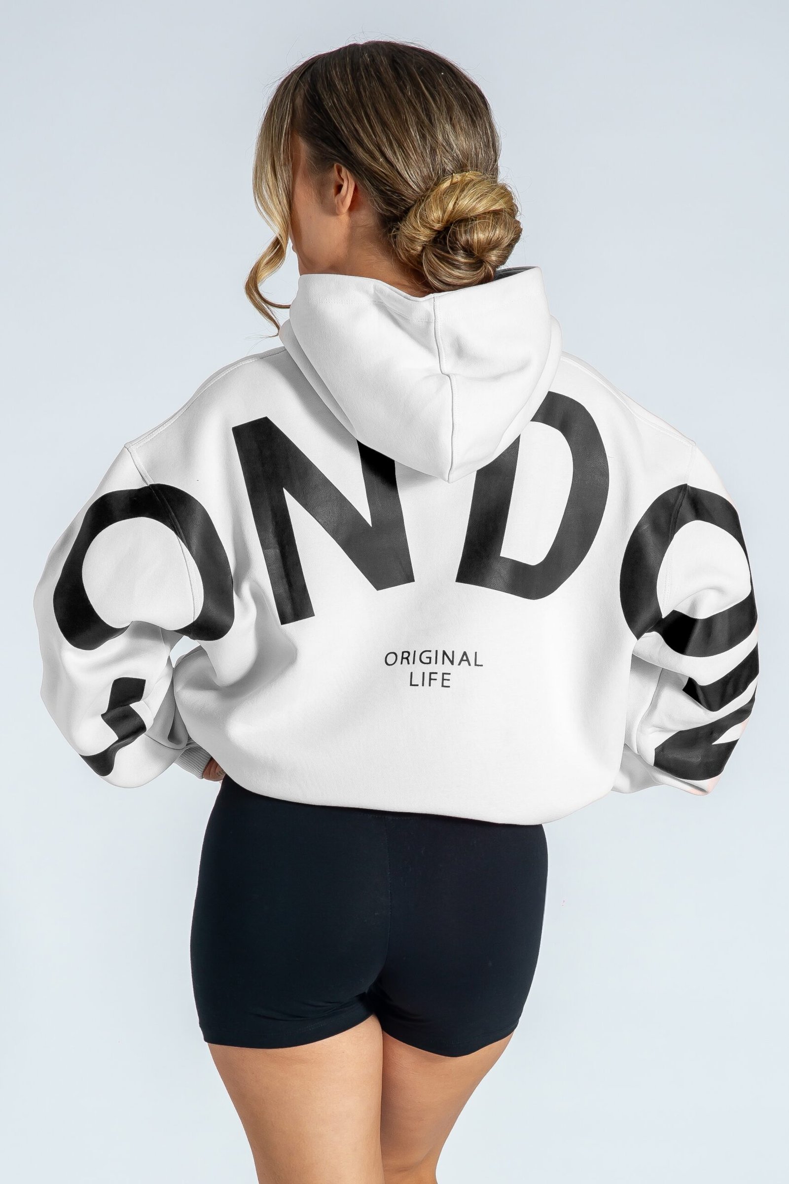STYLE: Oversized graphic hoodie featuring letter London bold print on the back with Kangaroo pockets for a trendy streetwear look.